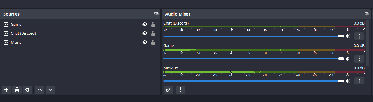 You should see a new fader in the OBS Audio Mixer displaying the audio levels for your new Music source. This is completely separate from the other PC audio sources like system sounds, game sounds, or Discord voice chat.