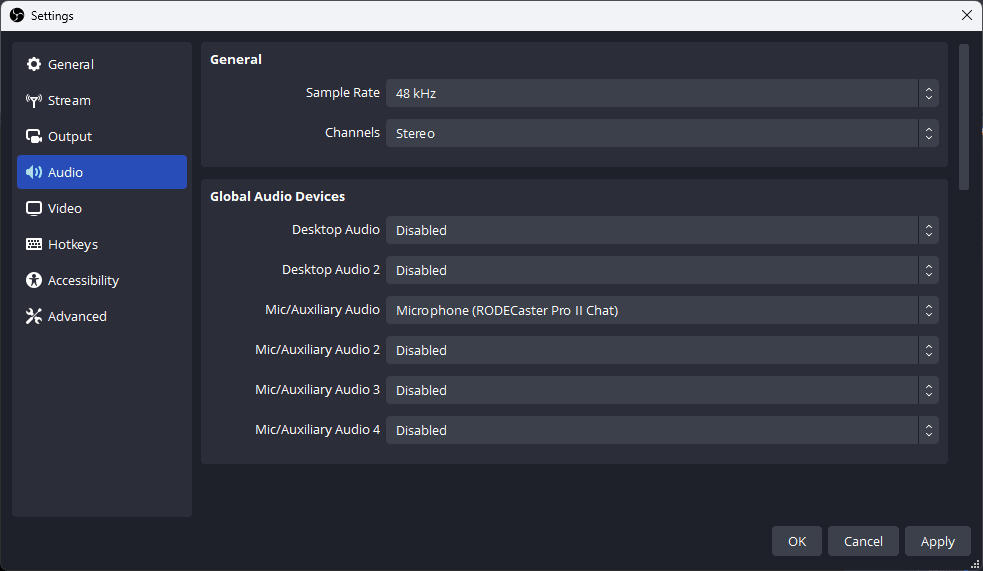 Let’s make sure our audio settings are set up correctly before adding individual audio sources. Open up your OBS settings, head to the Audio tab, and ensure that Desktop Audio and Desktop Audio 2 are both disabled to prevent duplicate audio.
