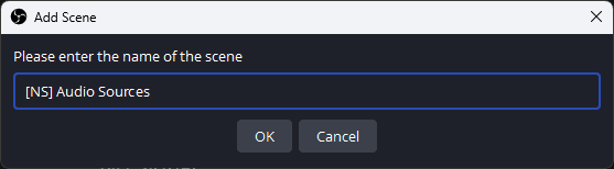 To avoid repetitive work, we can use a nested scene for all our individual audio sources instead of adding them to every single scene separately. Add a new scene named [NS] Audio Sources (the NS helps remind us it’s a Nested Scene). Now we can proceed to add our separate audio sources in OBS.
