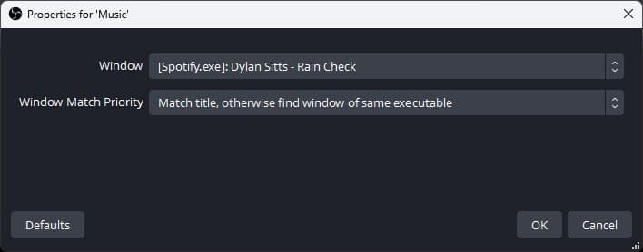 Play some music and switch back to the new nested scene in OBS. Add a new Application Audio Capture source and name it Music to keep things organized. Next, locate Spotify.exe (or the application you’re using to play music) in the Window dropdown.