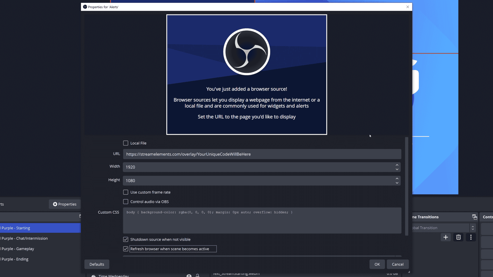 Browser Source, and paste in theURL. - Make sure the width and height match the canvas in StreamElements, then test some more actions to verify that everything is showing correctly in OBS.
