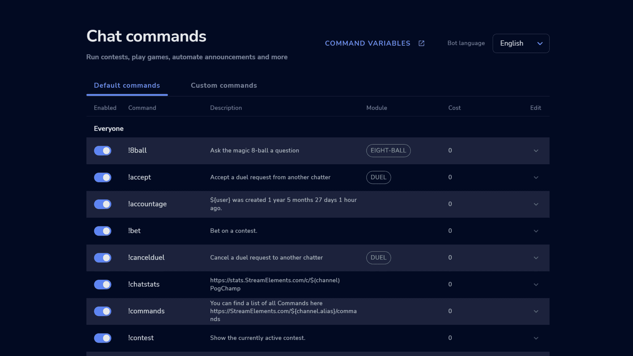 Unfortunately, there’s no easy way to import commands from Cloudbot. If you have many custom commands, the process may be time-consuming. However, StreamElements has several default commands that you can enable in one click.