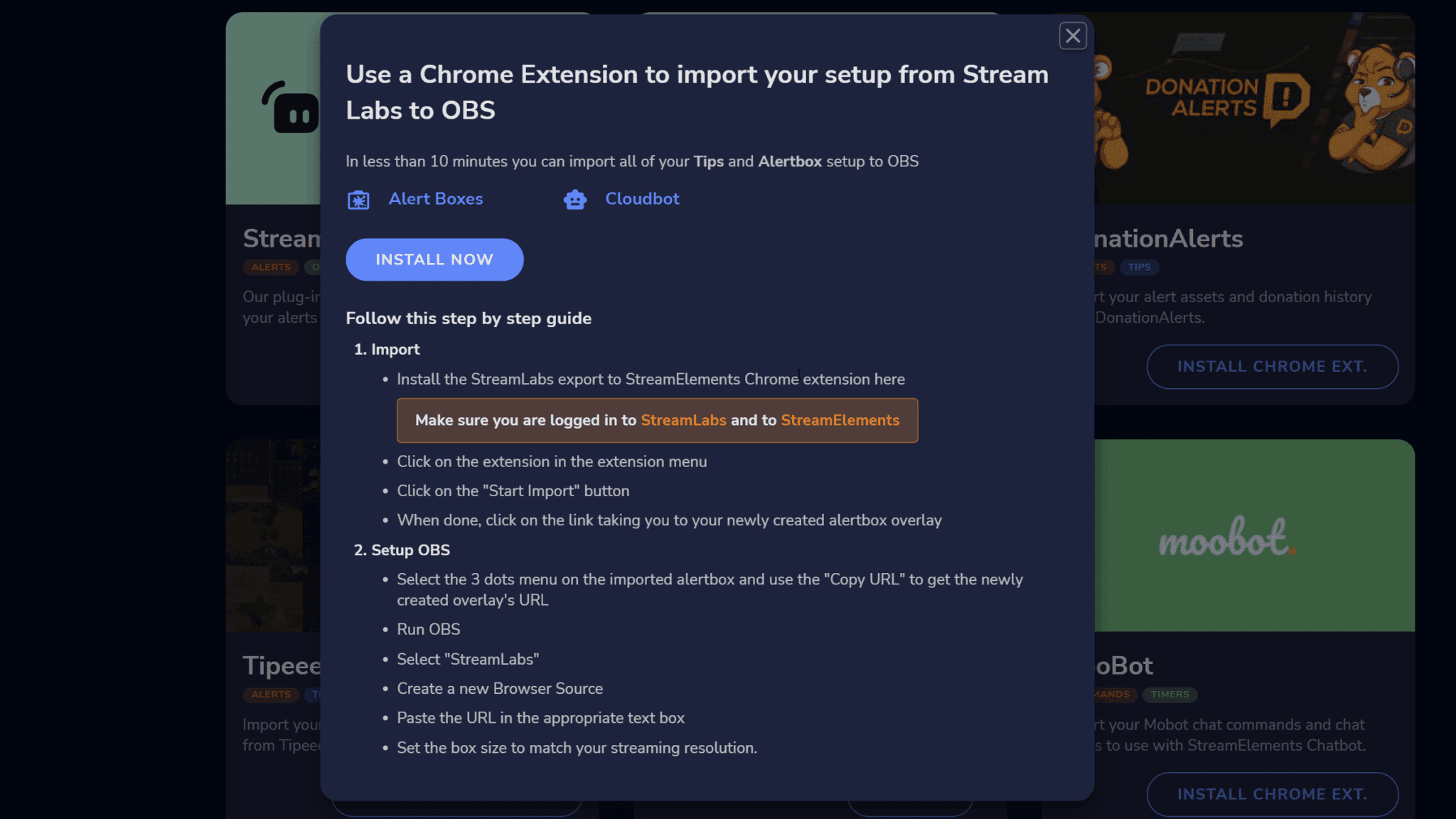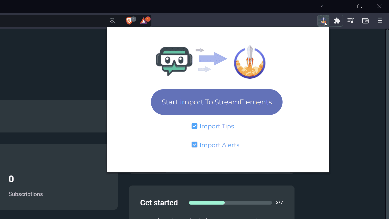 Install Nowand then head over to Streamlabs. - Open the extension and select if you want to import tips and alerts or just alerts. Click