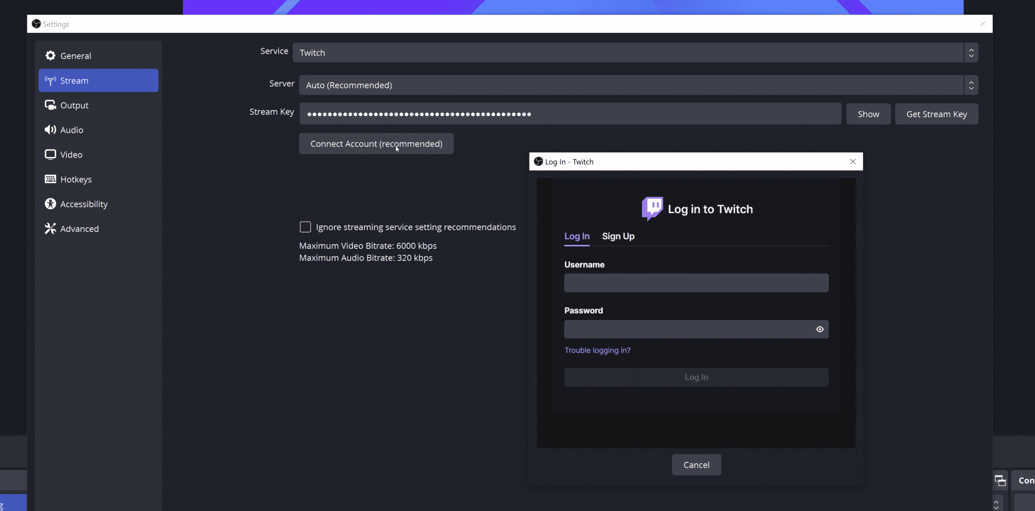 To do this, open OBS Studio’s settings, go to the Stream tab, select the Service you want to stream to (e.g. Twitch) and select Connect Account.