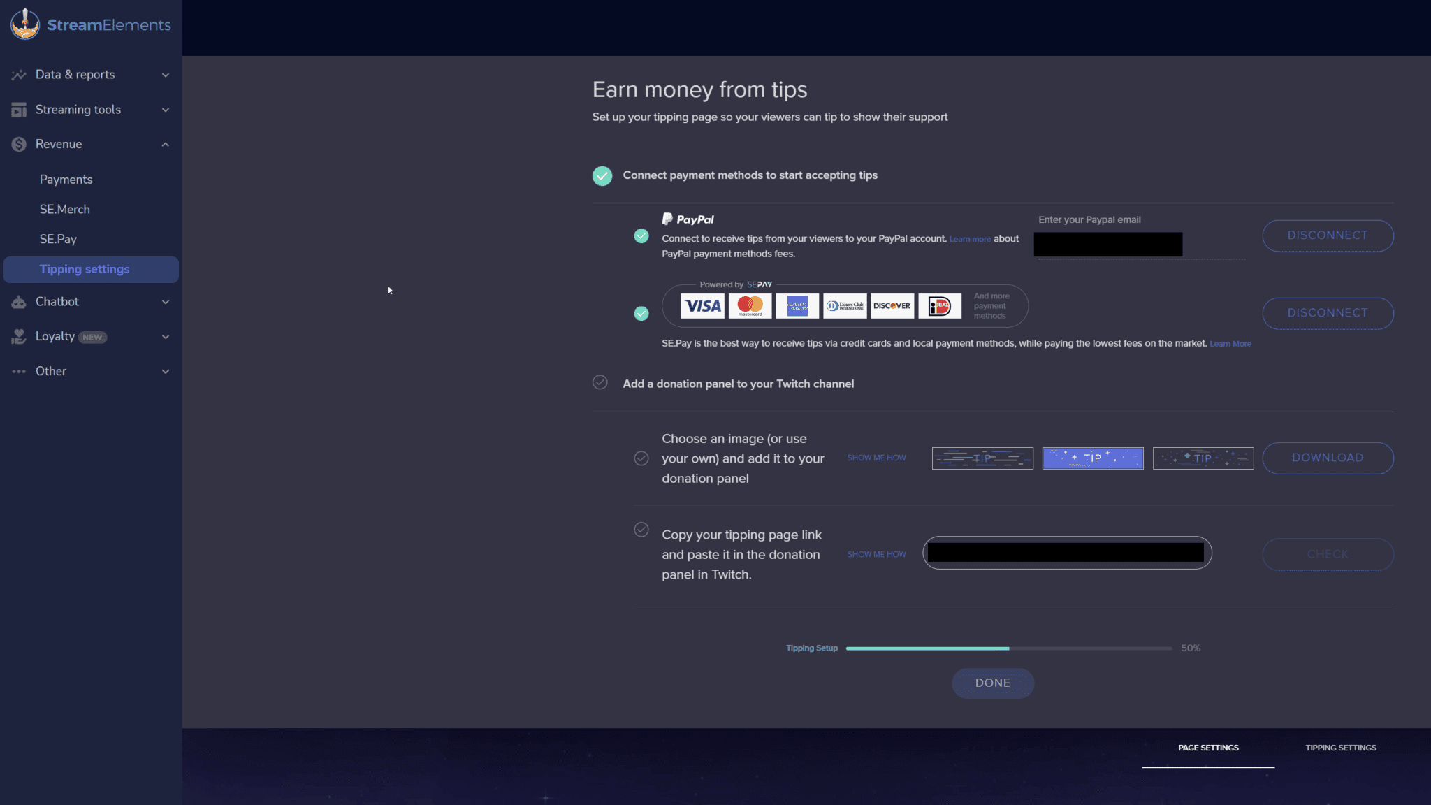Tipping Settingsin theRevenuetab. - Customize the page design, tipping settings, payment providers, currency, minimum, and maximum amounts, tip message or TTS filtering, etc.
