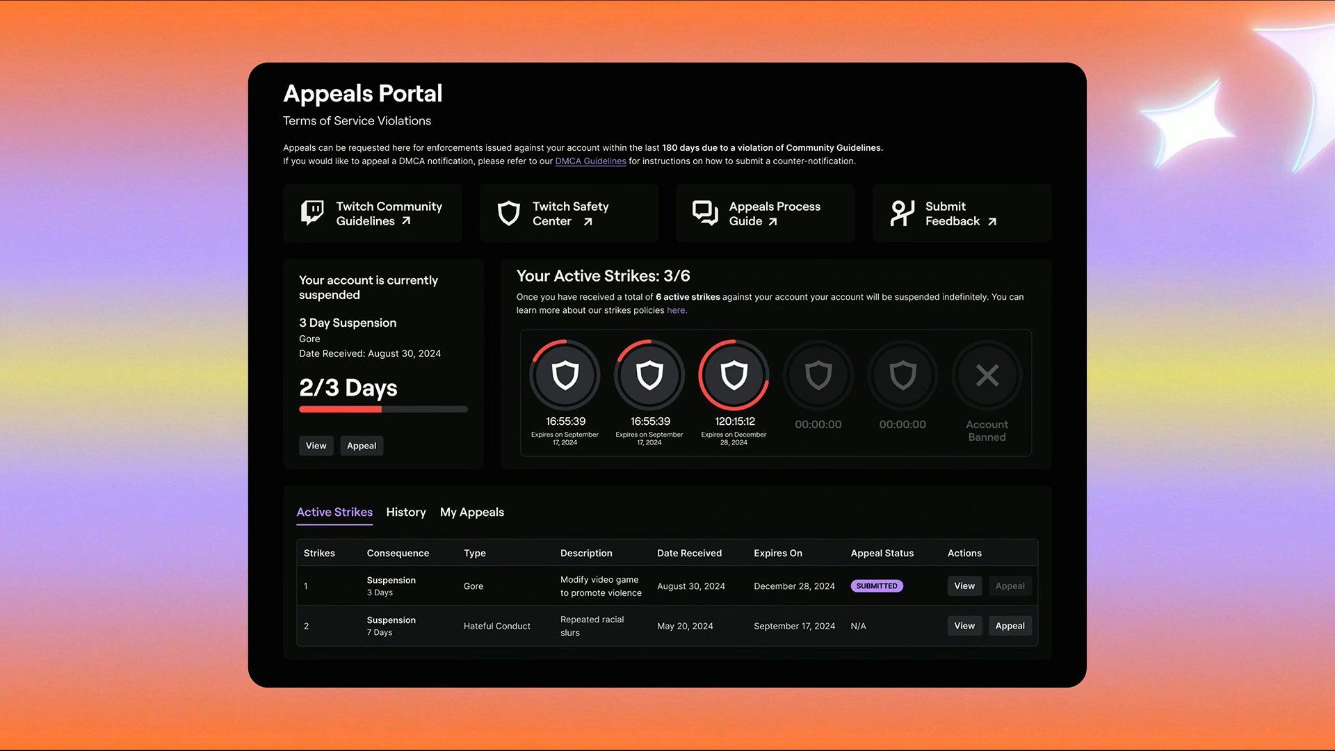 - More Transparency: For violations in Chat, you’ll now receive the exact excerpt where the violation occurred. Eventually, Twitch will also provide clips for infractions during livestreams or VODs.