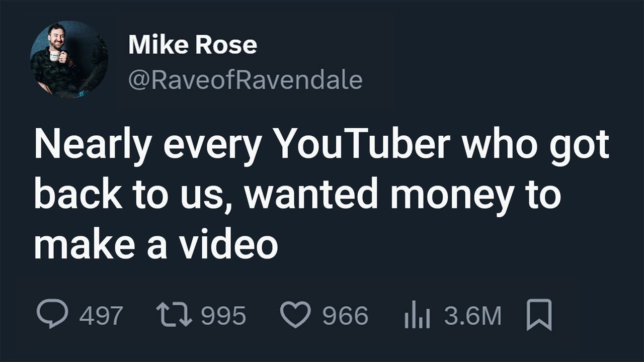 Now look, I get it — that's just how this works now. YouTubers want you to pay them to cover your games. Alright, sure. But I just don't want to do that. It feels weird and icky and disingenuous, and I just can't do it. So I guess our games won't get covered on YouTube anymore!— Mike Rose (@RaveofRavendale) November 20, 2023