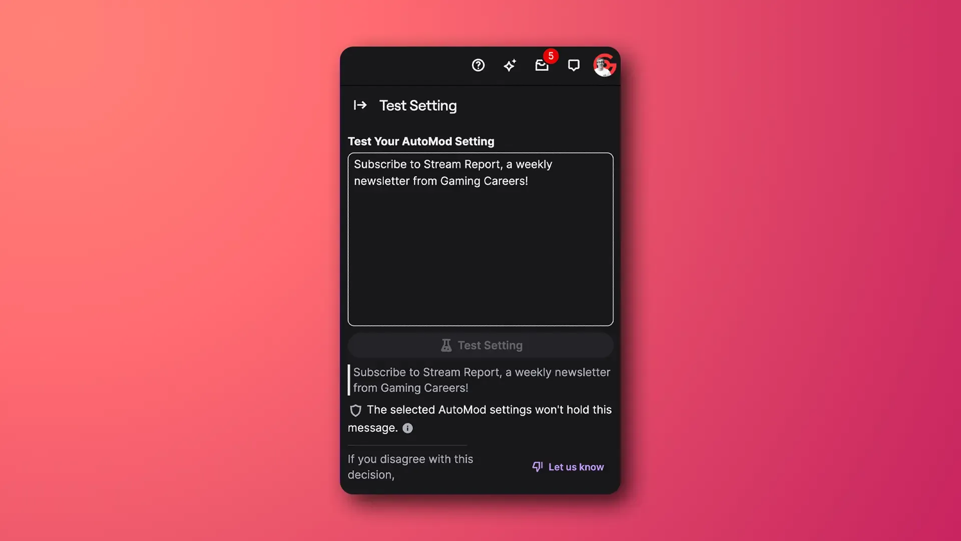 The testing tool helps you find that sweet spot where your filters actually protect your community without making your chat feel overly sanitized and restricted. You can test specific gaming terms, community inside jokes, or even controversial topics relevant to your content to make sure your settings make sense for your audience.