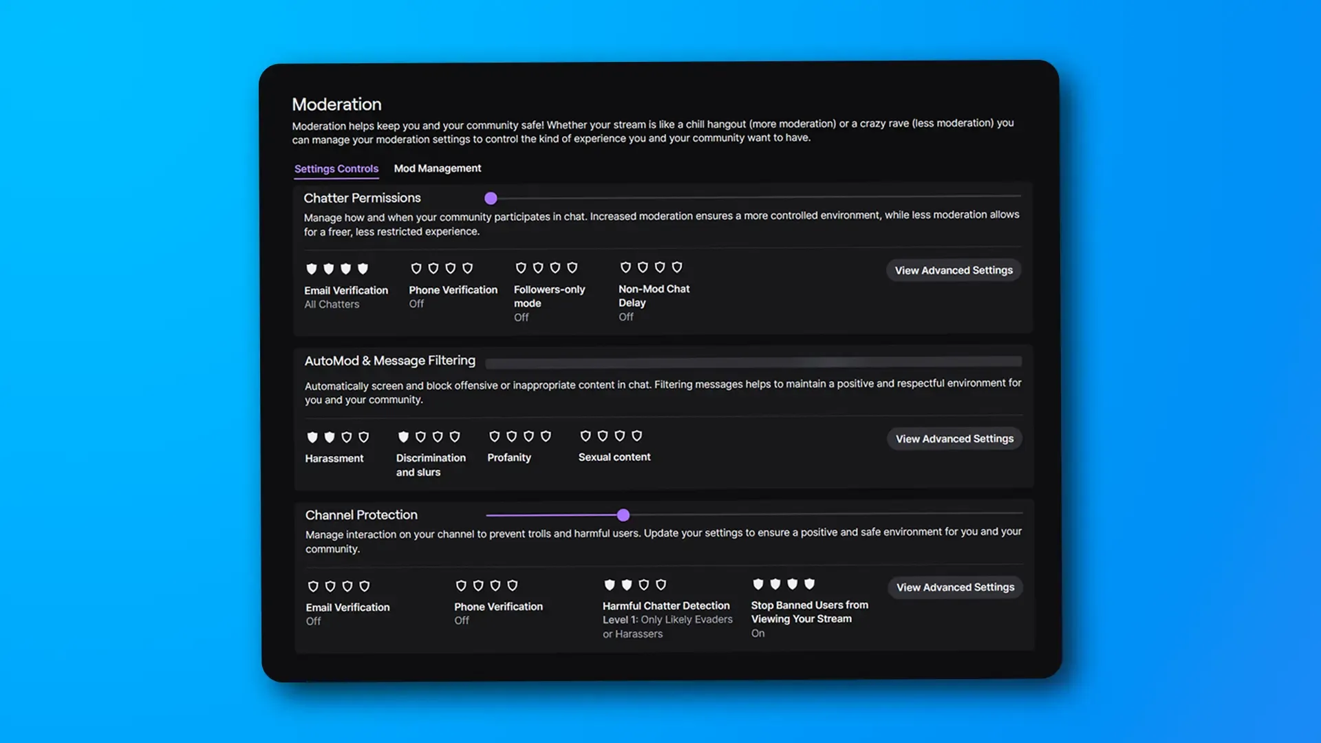 Twitch is also testing a simplified dashboard for Moderation Settings. The new layout organizes everything under clear headings like “Chatter Permissions,” “AutoMod & Message Filtering,” and “Channel Protection.”