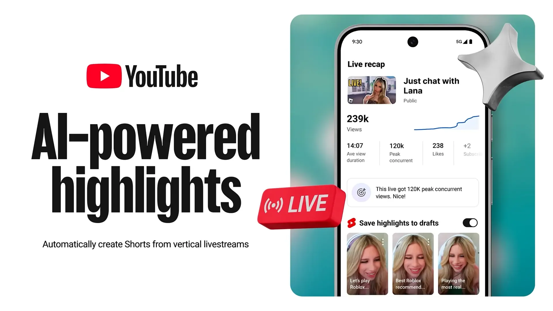 • Ask Studio: Conversational AI partner in YouTube Studio for analytics insights and content inspiration. US rollout in coming weeks.